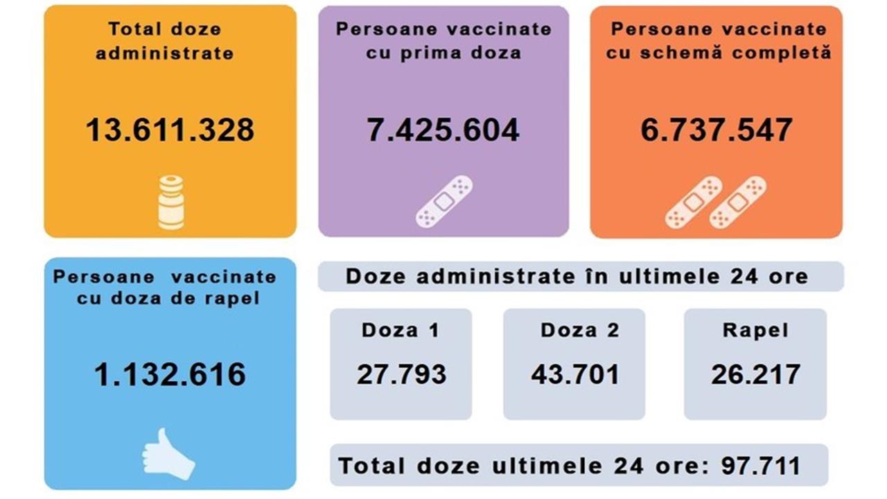 Comitetul de coordonare a vaccinării a transmis, vineri, că peste 97.700 persoane au fost vaccinate în ultimele 24 de ore, doar 27.793 cu prima doză sau serul Johnson&Johnson. Este investigată o reacţie...