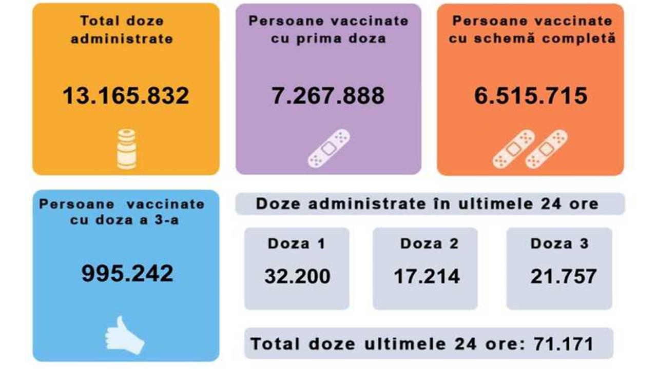 Comitetul Naţional de Coordonare a Activităţilor privind Vaccinarea împotriva COVID-19 (CNCAV) a anunţat sâmbătă că 71.171 de persoane au fost vaccinate în ultimele 24 de ore, din care 32.200 cu prima doză....