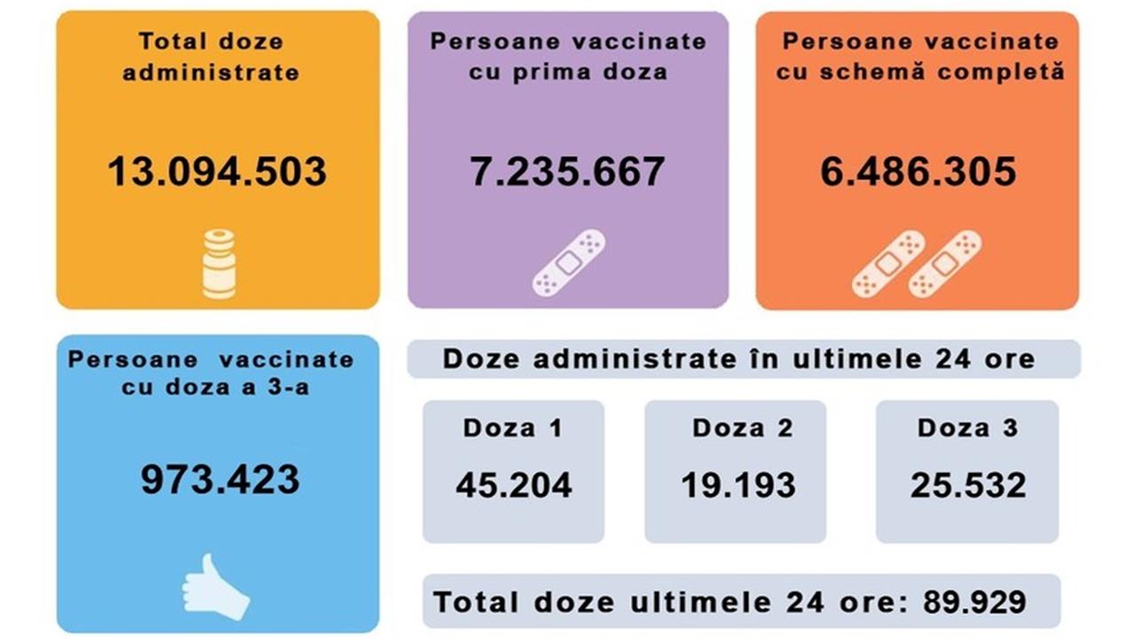 Comitetul de coordonare a vaccinării a transmis, vineri, că aproape 90.000 de persoane au fost vaccinate în ultimele 24 de ore, 45.204 cu prima doză sau cu serul Johnson&Johnson. Numărul celor vaccinaţi cu...
