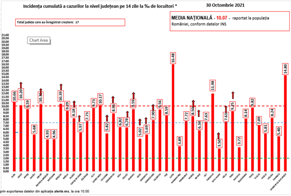Au fost raportate 18 decese anterioare intervalului de referință, survenite în județele Bacău, Dolj, Gorj, Maramureș, Ilfov și Municipiul București, în luna octombrie 2021. În intervalul de referință au fost raportate 395 decese.