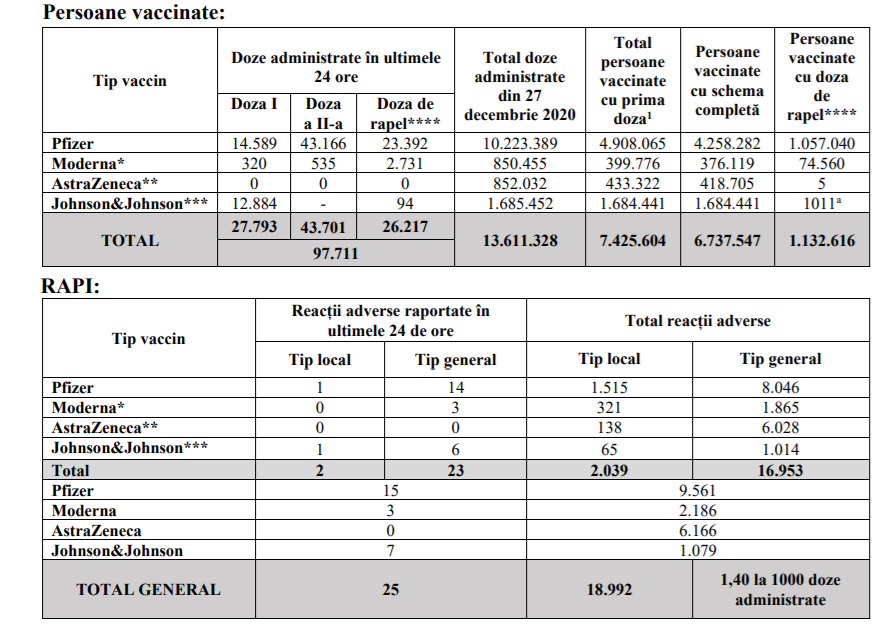 De la debutul campaniei de vaccinare au fost folosite 13.611.328 doze de vaccin, fiind imunizate cu schemă completă 6.737.547 persoane.