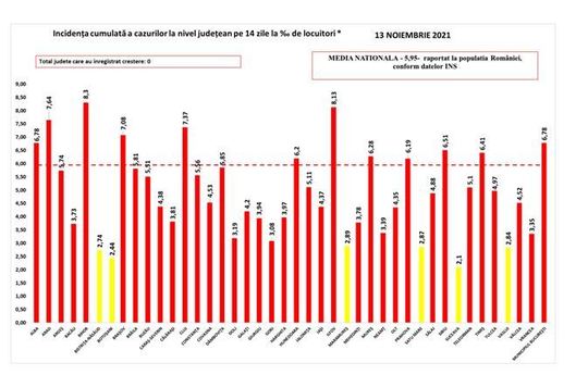Coeficientul infectărilor cumulate la 14 zile, raportate la 1.000 de locuitori este calculat de către Direcţiile de Sănătate Publică, este la nivel naţional de 5,95.