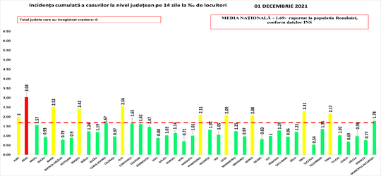 Coeficientul infectărilor cumulate la 14 zile, raportate la 1.000 de locuitori mai este peste 3 doar în Arad, în 9 judeţe este cuprins între 2 şi 3, în celelalte fiind sub 2.