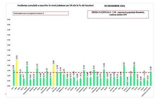 Coeficientul infectărilor cumulate la 14 zile, raportate la 1.000 de locuitori este calculat de către Direcţiile de Sănătate Publică, la nivelul Municipiului Bucureşti şi al judeţelor este 1,30 la mia de locuitori.