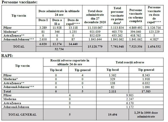 Numărul total al persoanelor vaccinate a ajuns la 7.791.948, din care 7.523.356 cu schema completă. Până în prezent, 1.654.532 de persoane s-au vaccinat cu doza a treia / doza de rapel.