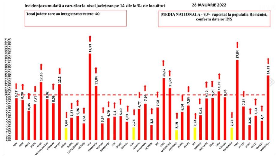 În total, până astăzi, 28 ianuarie, pe teritoriul României au fost înregistrate 2.146.558 de cazuri de infectare cu noul coronavirus (COVID – 19), dintre care 44.601 sunt ale unor pacienți reinfectați, testați pozitiv la o perioadă mai mare de 180 de zile după prima infectare. 1.894.077 de pacienți au fost declarați vindecați.
