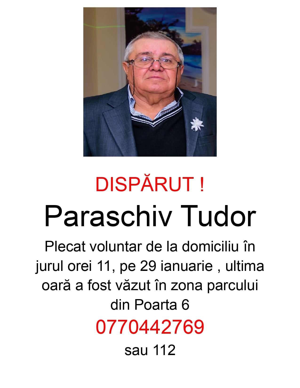 La data de 29 ianuarie, în jurul orei 18.30, polițiștii Secției 5 au fost sesizați cu privire la plecarea voluntară a lui PARASCHIV TUDOR, de 76 de ani, din municipiul Constanța.