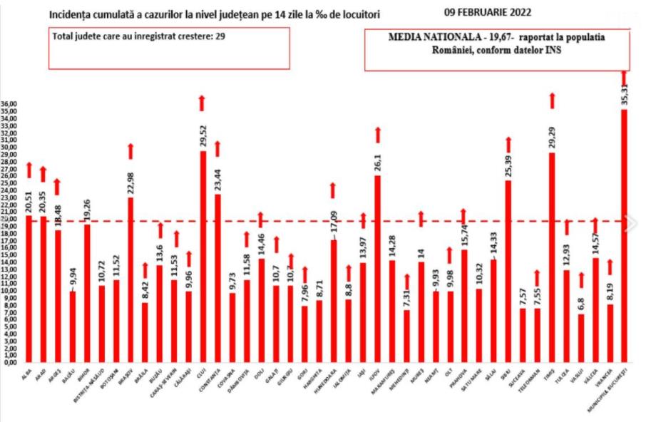 Coeficientul infectărilor cumulate la 14 zile, raportate la 1.000 de locuitori este 19,67 la nivel naţional şi este în creştere în 30 de judeţe şi în Bucureşti, unde are cea mai mare valoare, respectiv 35,31.