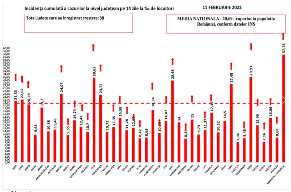 Coeficientul infectărilor cumulate la 14 zile, raportate la 1.000 de locuitori este 20,69 la nivel naţional şi este în creştere în 29 de judeţe şi în Bucureşti, unde are cea mai mare valoare, respectiv 37,78, urmat de Cluj - 29,65, Timiș - 29,93, Ilfov - 28,68 și Sibiu 27,48.