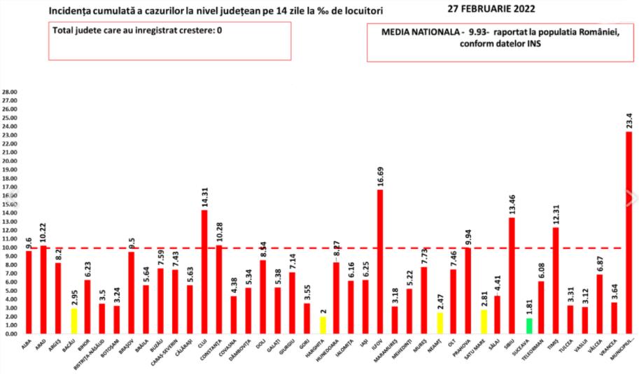 În intervalul 26.02.2022 (10:00) – 27.02.2022 (10:00) au fost raportate de către INSP 59 de decese (35 bărbați și 24 femei), dintre care 3 anterioare intervalului de referință, ale unor pacienți infectați cu noul coronavirus, internați în spitalele din Alba, Arad, Bacău, Bistrița-Năsăud, Brăila, Călărași, Caraș-Severin, Dâmbovița, Dolj, Giurgiu, Gorj, Maramureș, Mehedinți, Olt, Prahova, Satu Mare, Sibiu, Timiș, Vaslui, Vrancea și Municipiul București.