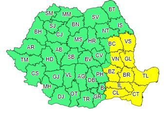 Meteorologii au emis un cod galben privind intensificări ale vântului, începând de joi seară, în zece judeţe din Moldova, Dobrogea şi estul Munteniei. La finalul săptămânii, temperatura va scădea, iar vremea va deveni răcoroasă în timpul nopţilor şi dimineţilor.