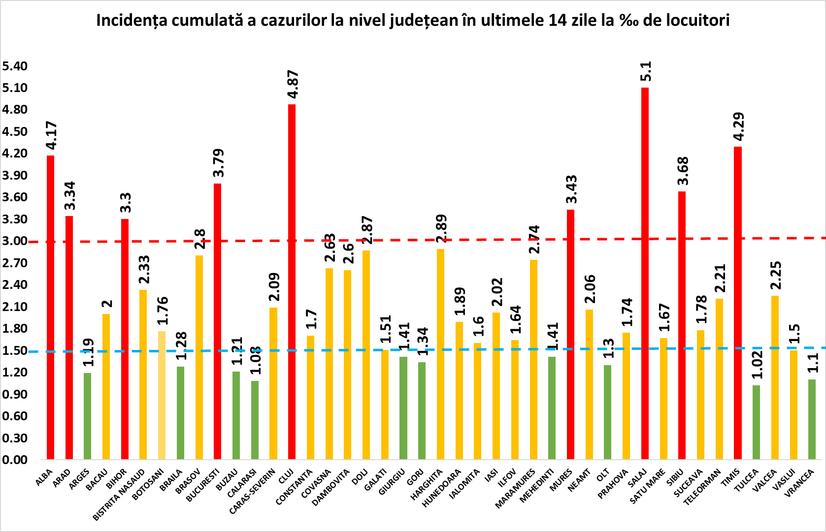 Coeficientul infectărilor cumulate la 14 zile, raportate la 1.000 de locuitori este calculat de către Direcțiile de Sănătate Publică, care depășește incidența de 3 la mia de locuitori s-a raportat în: Sălaj – 5.1, Cluj – 4.87, Timiș – 4.29, Alba – 4.17, București – 3.79, Sibiu – 3.68, Mureș – 3.43, Arad – 3.34 și Bihor – 3.3.