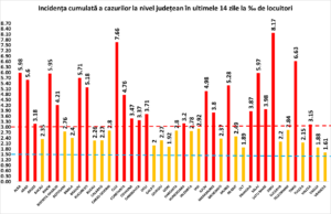 Dintre noile cazuri confirmate, peste 100 au fost înregistrate în: municipiul București – 1274, Cluj – 601, Sibiu – 426, Ilfov – 420, Brașov – 415, Timiș – 397, Bihor – 373, Iași – 373, Mureș – 351, Prahova – 336, Constanța – 313, Dolj – 278, Arad – 243, Alba – 238, Argeș – 234, Brăila – 200, Suceava – 199, Dâmbovița – 190, Bacău – 182, Olt – 173, Bistrița-Năsăud – 169, Hunedoara – 137, Satu Mare – 135, Teleorman – 119, Galați – 112, Maramurel – 108, Vâlcea – 106, Buzău – 103 și Giurgiu – 101.