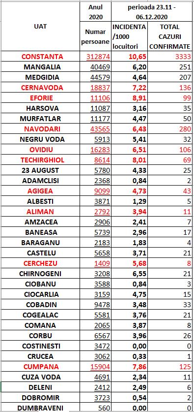 De asemenea, orașul Eforie a înregistrat rata de incidență 8,91 la mia de locuitori, comuna Valu lui Traian a înregistrat 8,20 la mia de locuitori, satul Cumpăna 7,86 la mia de locuitori, comuna Mihail Kogălniceanu 7,86 la mia de locuitori, iar orașul Techirghiol 8,01 la mia de locuitori.