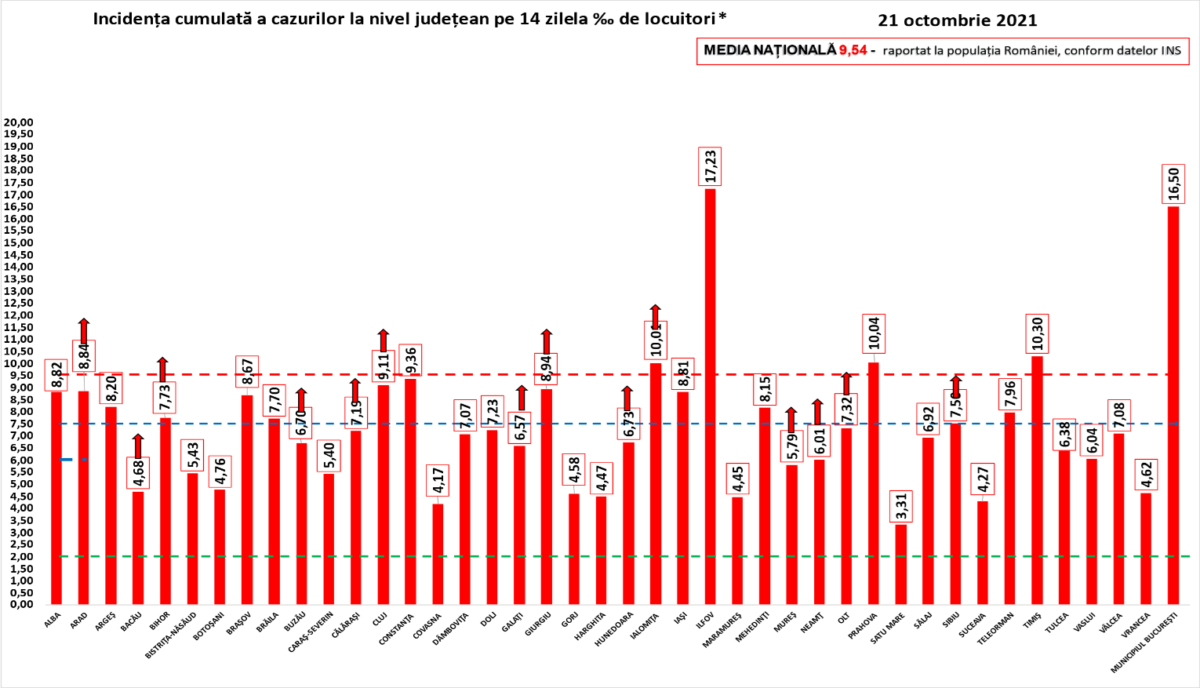 Coeficientul infectărilor cumulate la 14 zile, raportate la 1.000 de locuitori este peste 3 în toate judeţele, în Ilfov având cea mai mare valoare, 17,23. În Bucureşti, valoarea acestui coeficient este 16,50.