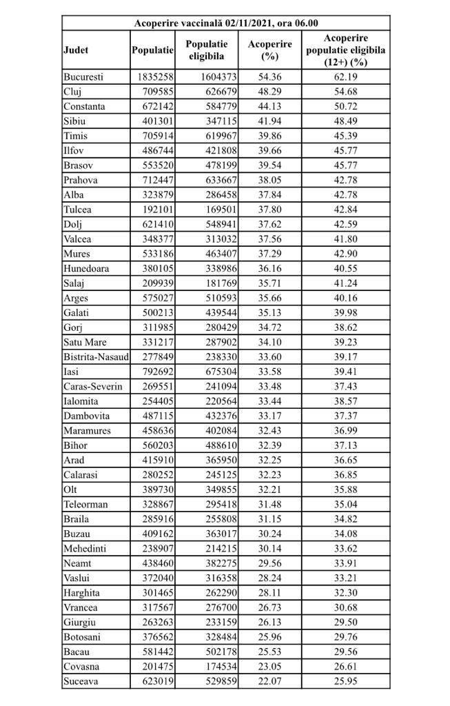 Acoperire vaccinală 2 noiembrie, în România: