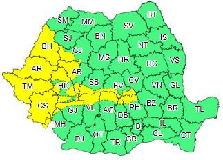 Administraţia Naţională de Meteorologie (ANM) a emis o atenţionare Cod galben privind intensificări ale vântului, valabilă de miercuri, de la ora 20.00, până joi, la ora 23.00, în judeţele Alba, Argeş, Arad, Bihor, Braşov, Cluj, Caraş-Severin, Dâmboviţa, Gorj, Hunedoara, Mehedinţi, Prahova, Sibiu, Timiş şi Vâlcea.