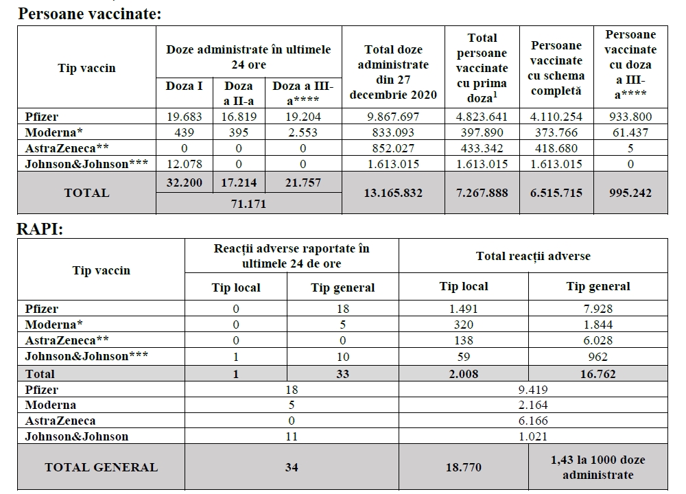 Potrivit CNCAV, în ultimele 24 de ore au fost vaccinate 71.171 de persoane. Dintre acestea, 12.078 s-au prezentat pentru a primi prima doză de ser sau doza unică de la Johnson & Johnson. Alte 22.513 persoane s-au vaccinat cu doza a treia.