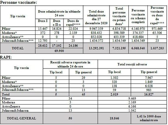 Numărul persoanelor vaccinate a ajuns astfel la 7.321.195, din care 6.568.540 cu schema completă. Până în prezent, 1.037.203 de persoane s-au vaccinat cu doza a treia.
