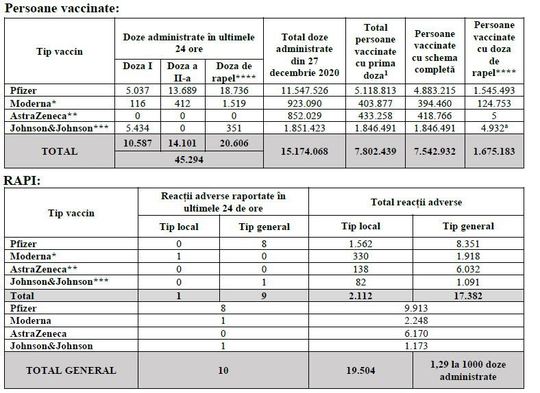 Numărul total al persoanelor vaccinate a ajuns la 7.802.439, din care 7.542.932 cu schema completă. Până în prezent, 1.675.183 de persoane s-au vaccinat cu doza a treia / doza de rapel.