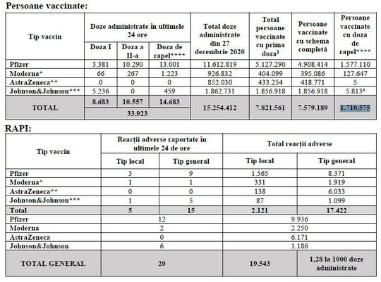 Numărul total al persoanelor vaccinate a ajuns la 7.821.561, din care 7.579.189 cu schema completă. Până în prezent, 1.710.575 s-au vaccinat cu doza a treia / doza de rapel.