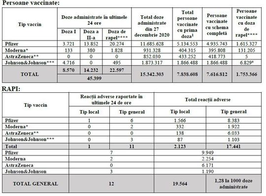 Potrivit CNCAV, în ultimele 24 de ore au fost vaccinate 45.399 de persoane. Dintre acestea, 8.570 de persoane au fost vaccinate cu prima doză sau cu doza unică de la compania Johnson & Johnson. Alte 22.597 de persoane au fost vaccinate cu doza a treia / doza de rapel, în cazul vaccinului Johnson & Johnson.