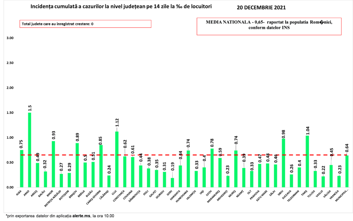 Coeficientul infectărilor cumulate la 14 zile, raportate la 1.000 de locuitori este la nivel naţional 0,65. Trei judeţe mai au valoarea acestui coeficient peste 1.