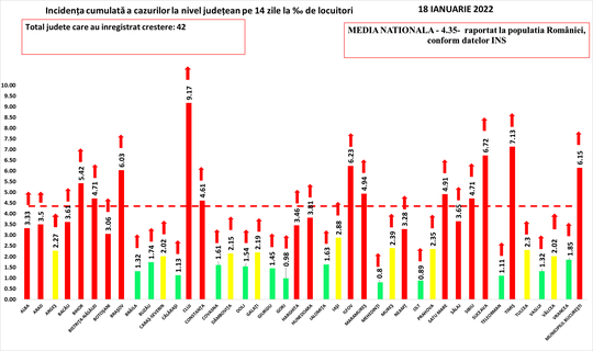 În total, până astăzi, 18 ianuarie, pe teritoriul României au fost înregistrate 1.928.306 cazuri de infectare cu noul coronavirus (COVID – 19), dintre care 22.316 sunt ale unor pacienţi reinfectaţi, testaţi pozitiv la o perioadă mai mare de 180 de zile după prima infectare. 1.784.107 pacienţi au fost declaraţi vindecaţi.